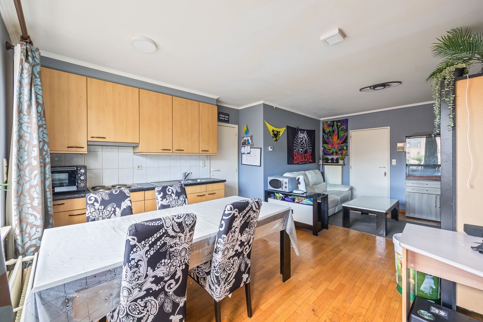 Het appartement bestaat uit een lichtrijke leefruimte (afgewerkte met parket) en een open keuken met grote raampartijen die toegang geven tot het balkon. Aansluitend aan de keuken bevindt zich een praktische berging.