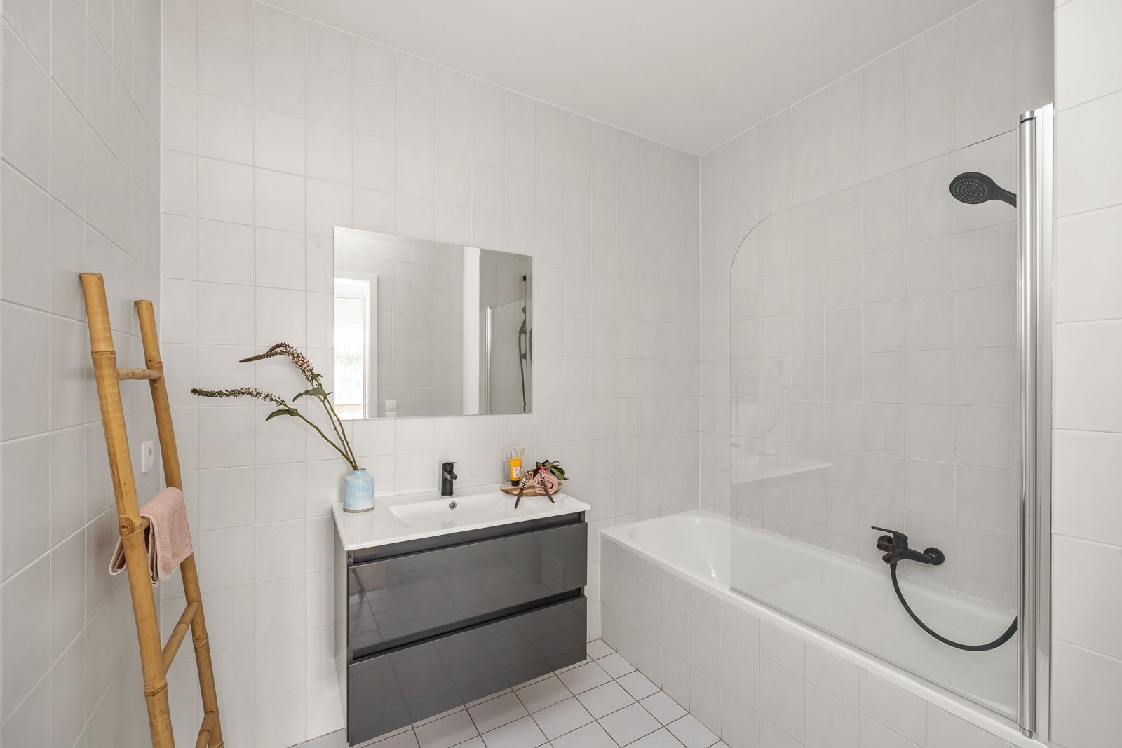 Verder zijn er 2 slaapkamers aanwezig, waarvan één slaapkamer directe toegang geeft tot het terras. Ook de badkamer werd volledig vernieuwd en beschikt over een lavabo met badkamermeubel en een douchebad, deze werden afgewerkt met zwart kraanwerk. Om het appartement compleet te maken is er een praktische en aparte bergruimte aanwezig. Het terras achteraan heeft een mooi uitzicht op het groen. Tot slot is er een apart toilet voorzien in het appartement.