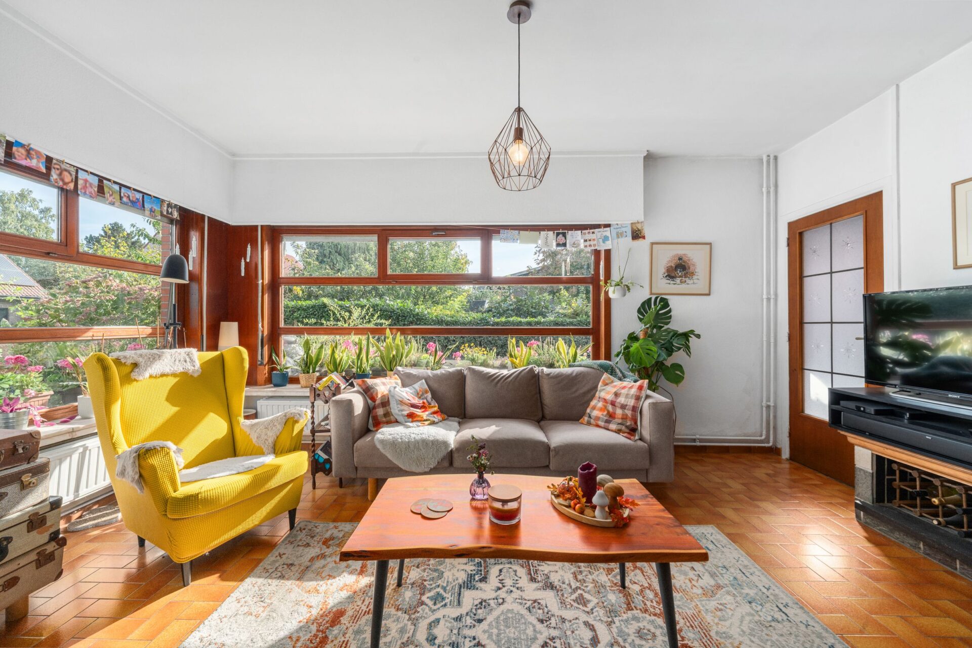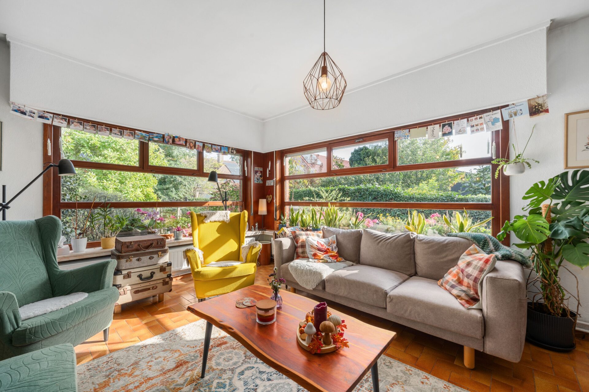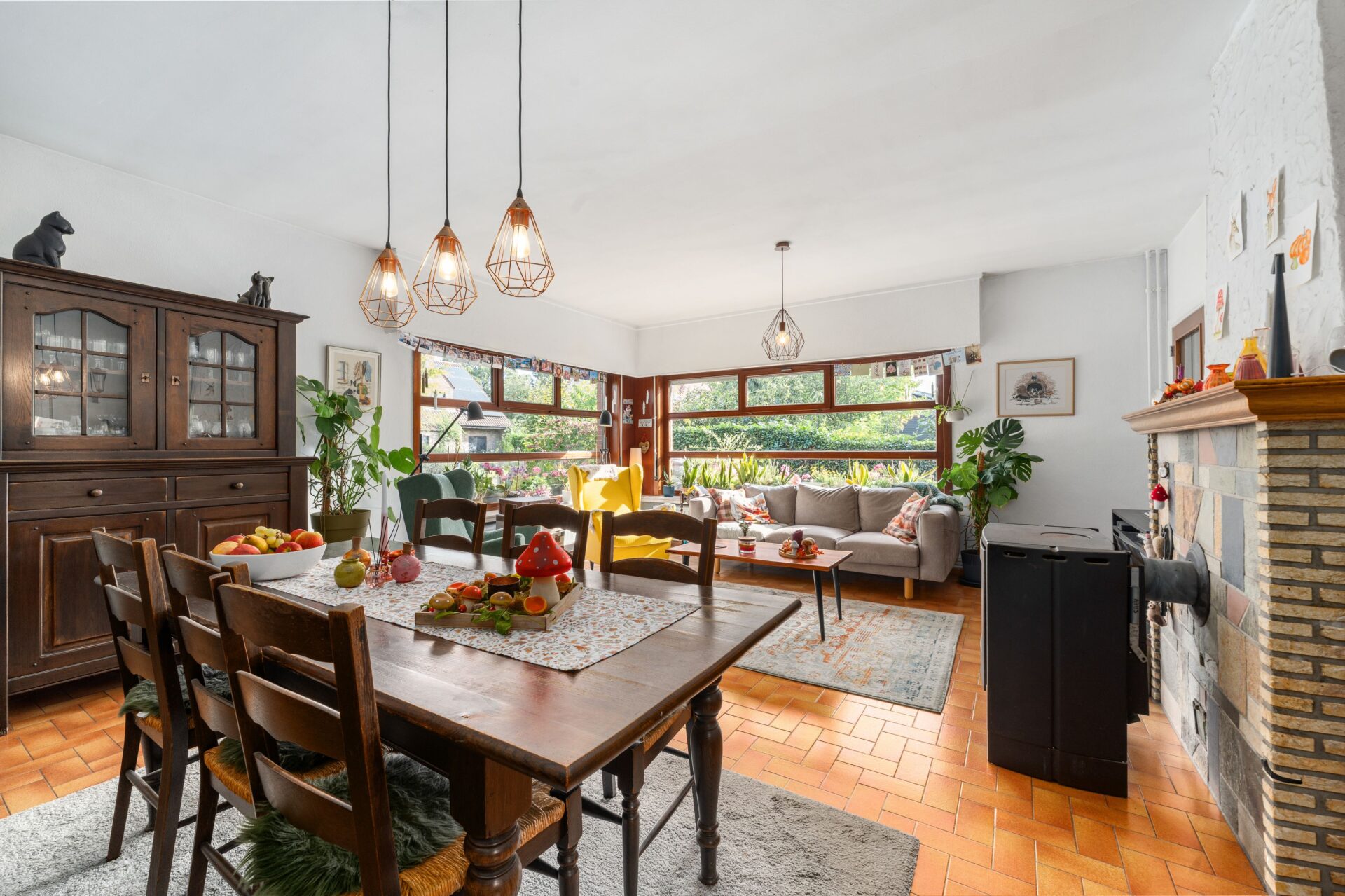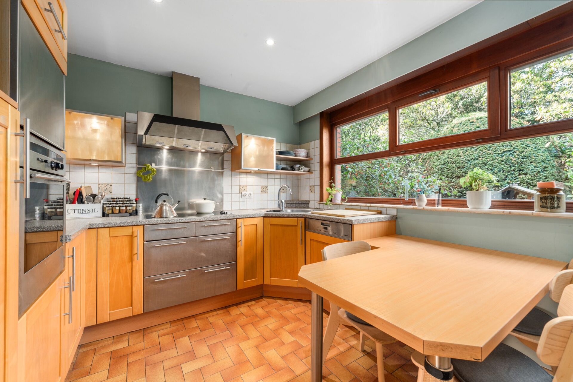 Deze woning ademt karakter en biedt een ruime, lichtrijke leefruimte. Grote ramen laten het daglicht hier rijkelijk binnenstromen en bieden tegelijk een prachtig uitzicht op het omliggende groen. De volledig uitgeruste keuken sluit perfect aan op de leefruimte en is voorzien van voldoende bergruimte.