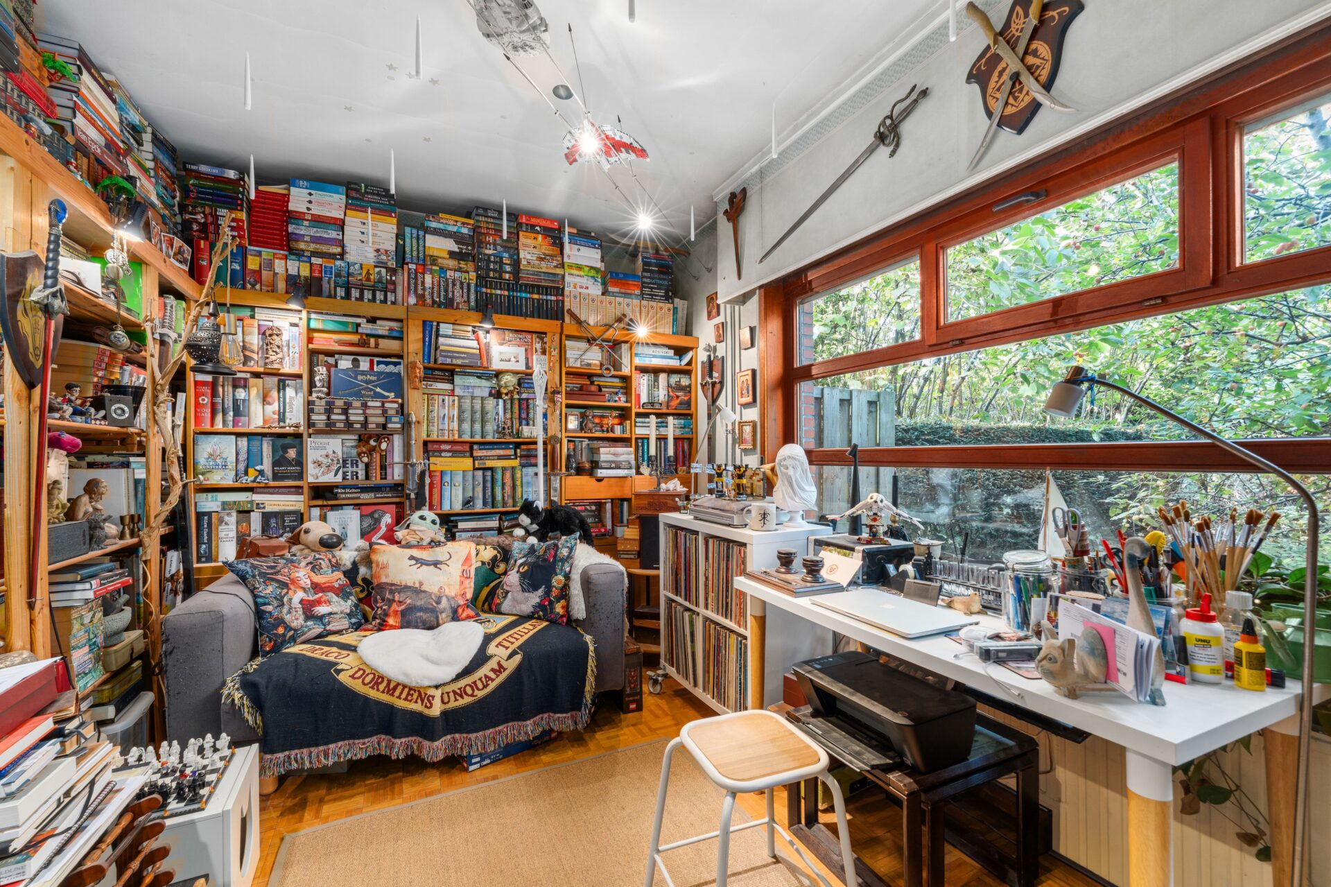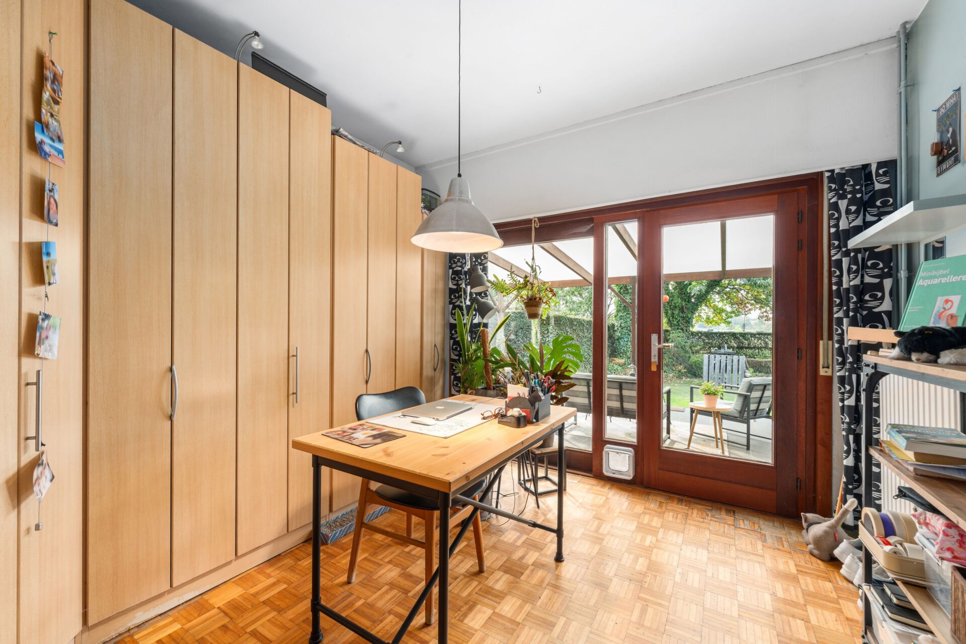 Daarnaast vindt u op het gelijkvloers een multifunctionele kamer die momenteel dienstdoet als hobbyruimte. Deze plek biedt tal van mogelijkheden. Alsook is er een afzonderlijke bureauruimte, dankzij het grote raam geniet u hier van een rustgevend uitzicht op de achterliggende tuin.
