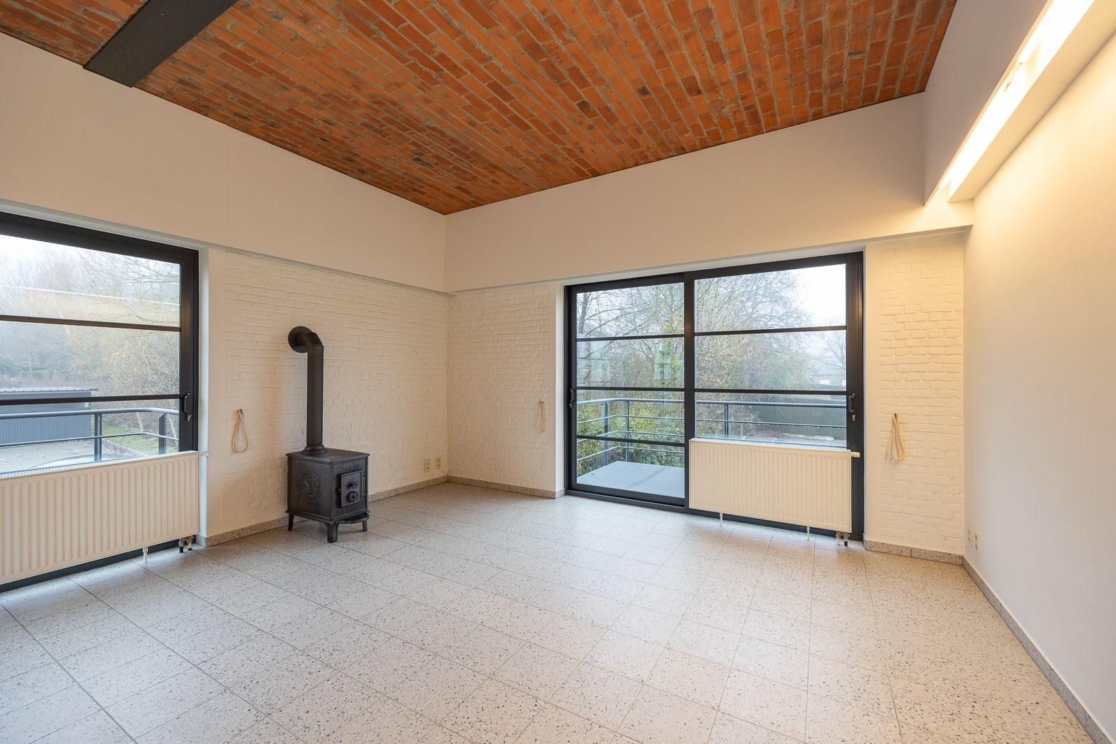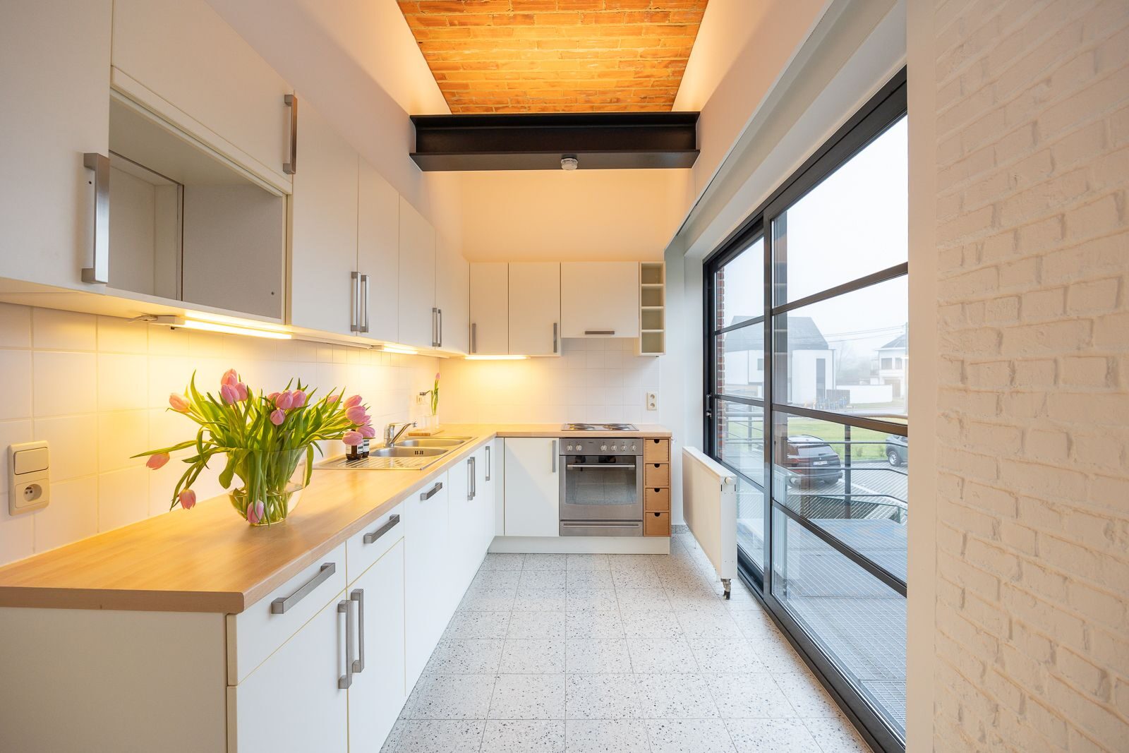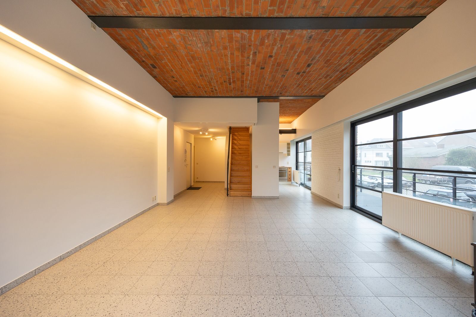 De indeling is als volgt: U betreedt het appartement via de inkomhal met gastentoilet en aparte berging. Deze leidt u naar de ruime en lichtrijke woonkamer met keuken. Dankzij de 3 grote raampartijen geniet u hier de hele dag door van een overvloed aan natuurlijk licht. Alle schuiframen geven toegang tot de terrassen. De karaktervolle leefruimte wordt gekenmerkt door grote ramen, bakstenen muren en hoge plafonds. Op deze verdieping vindt u tevens de badkamer.