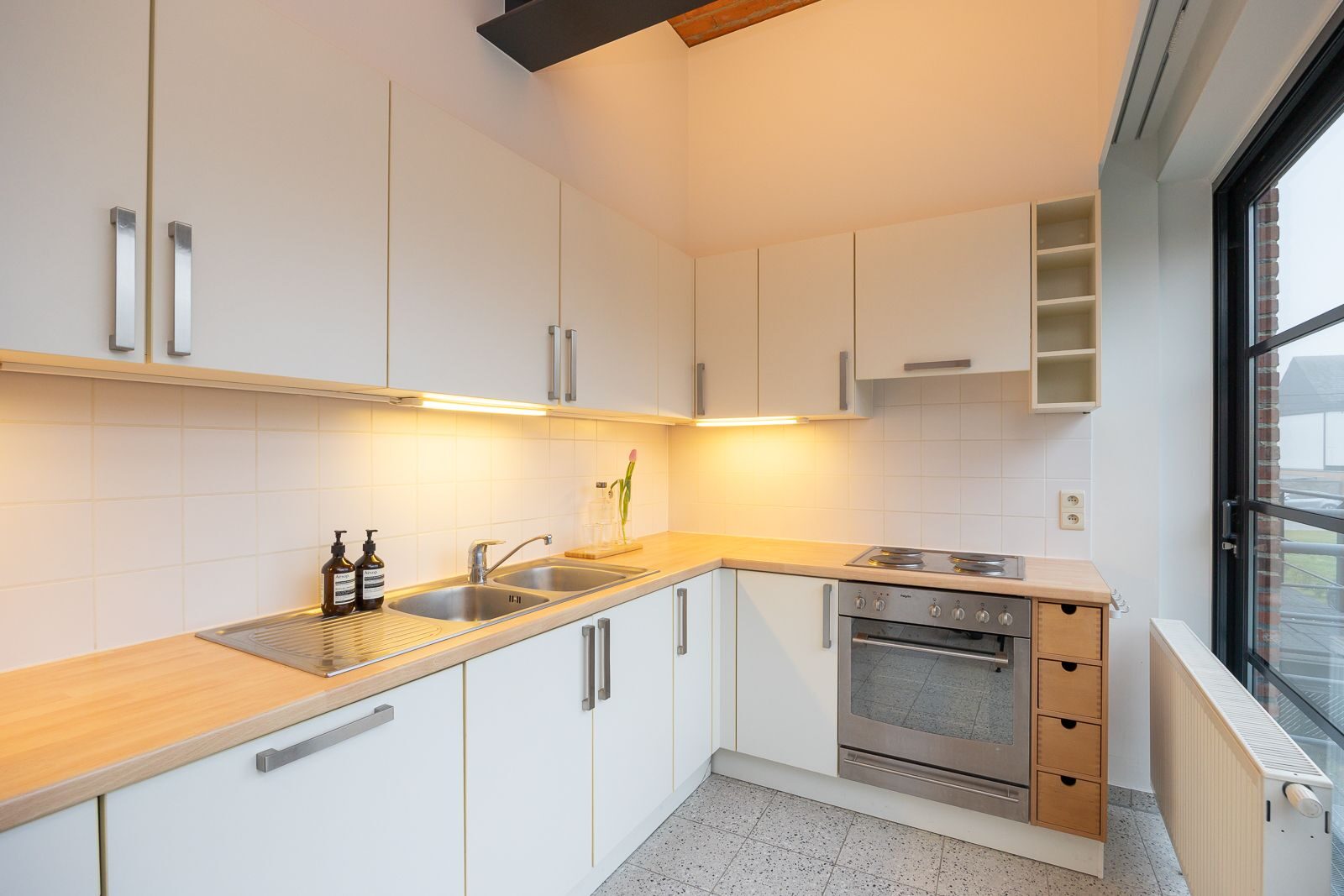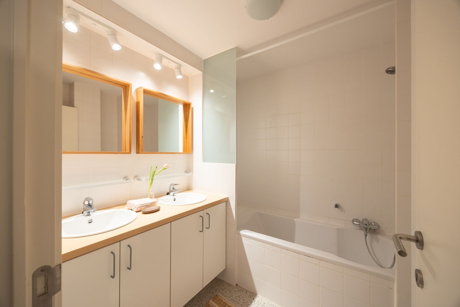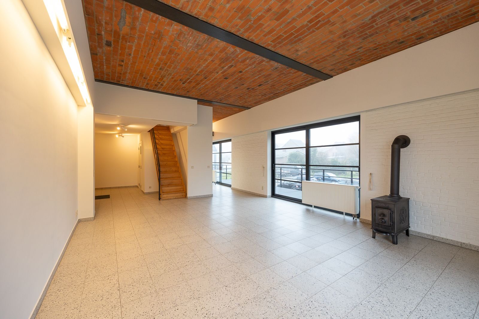De indeling is als volgt: U betreedt het appartement via de inkomhal met gastentoilet en aparte berging. Deze leidt u naar de ruime en lichtrijke woonkamer met keuken. Dankzij de 3 grote raampartijen geniet u hier de hele dag door van een overvloed aan natuurlijk licht. Alle schuiframen geven toegang tot de terrassen. De karaktervolle leefruimte wordt gekenmerkt door grote ramen, bakstenen muren en hoge plafonds. Op deze verdieping vindt u tevens de badkamer.
