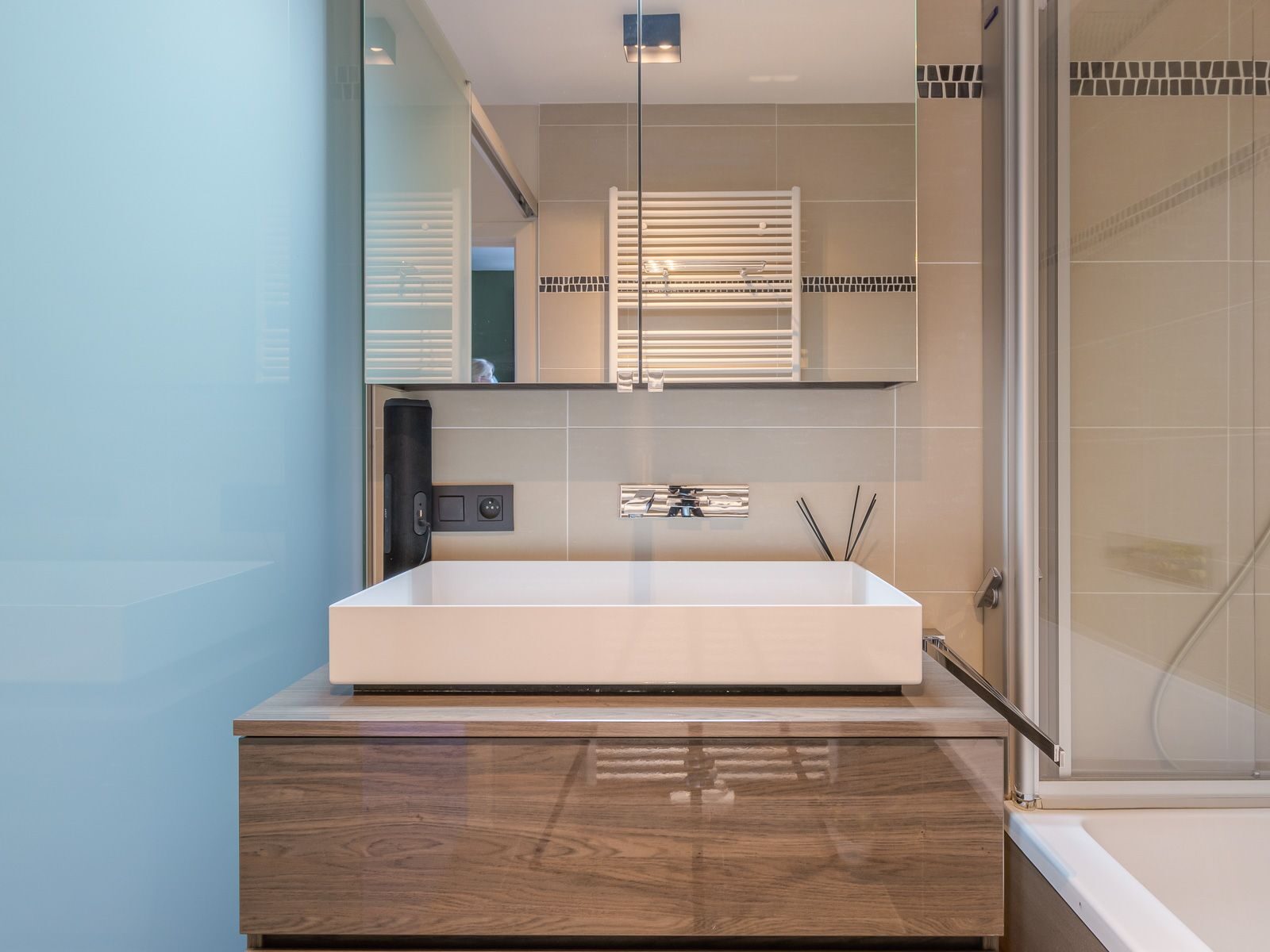 In de afgesloten berging is er plaats voor was- en droogkast. De badkamer met ligbad en grote lavabo bevindt zich tevens in de nachthal bij de slaapkamers. Als extra troef bevindt zich ook aansluitend aan de slaapkamers een zeer ruim terras van maar liefst 23 m2. De huur omvat tevens op de kelderverdieping twee privatieve bergingen en een garagebox, aan €70 per maand. De algemene lasten bedragen €75 per maand.