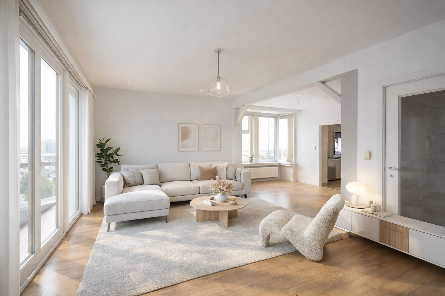 Op de 1e verdieping komt u binnen in de lichtrijke leefruimte met aansluitend de eetkamer. Verder bevindt zich de (half)open keuken die toegang geeft tot de veranda.