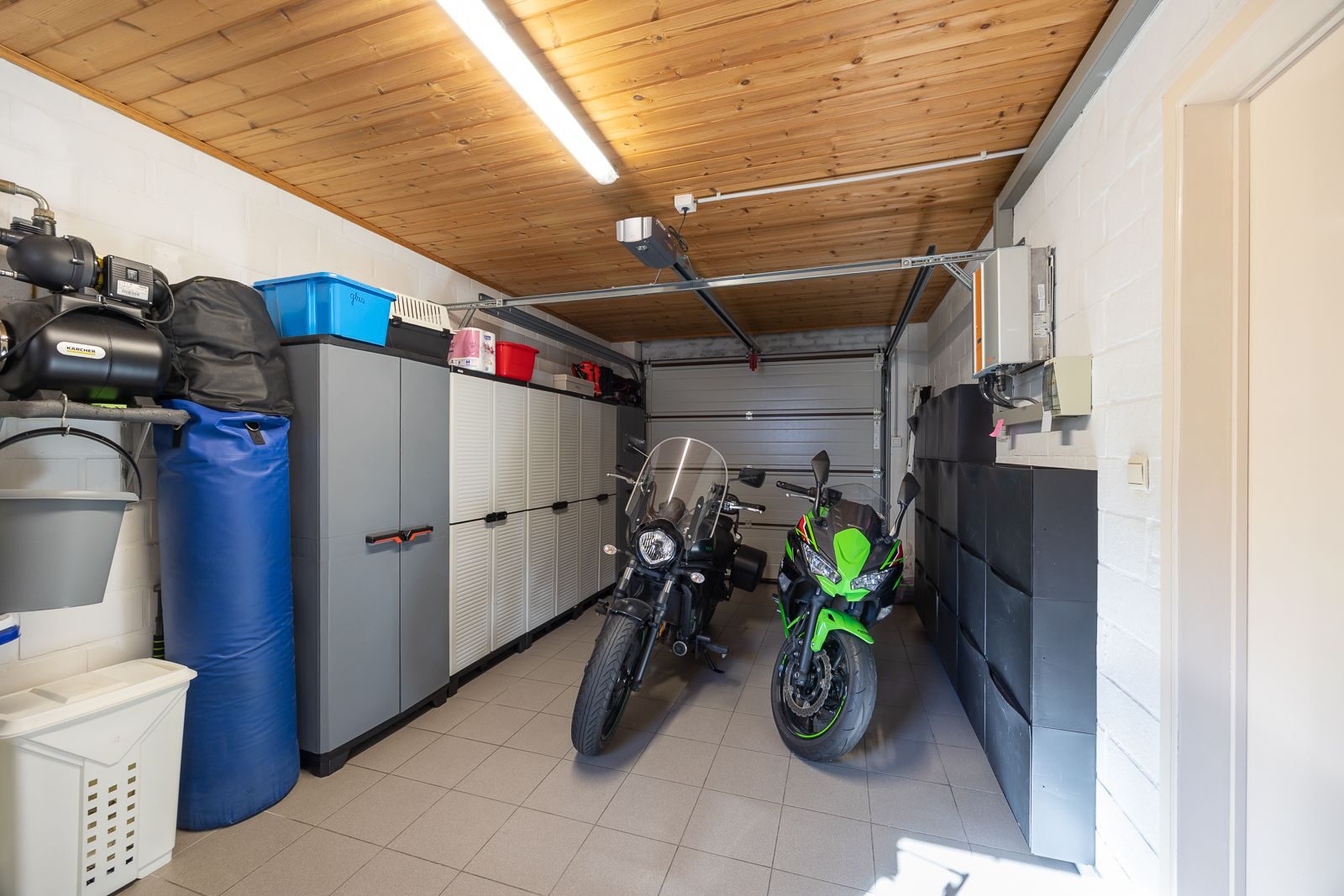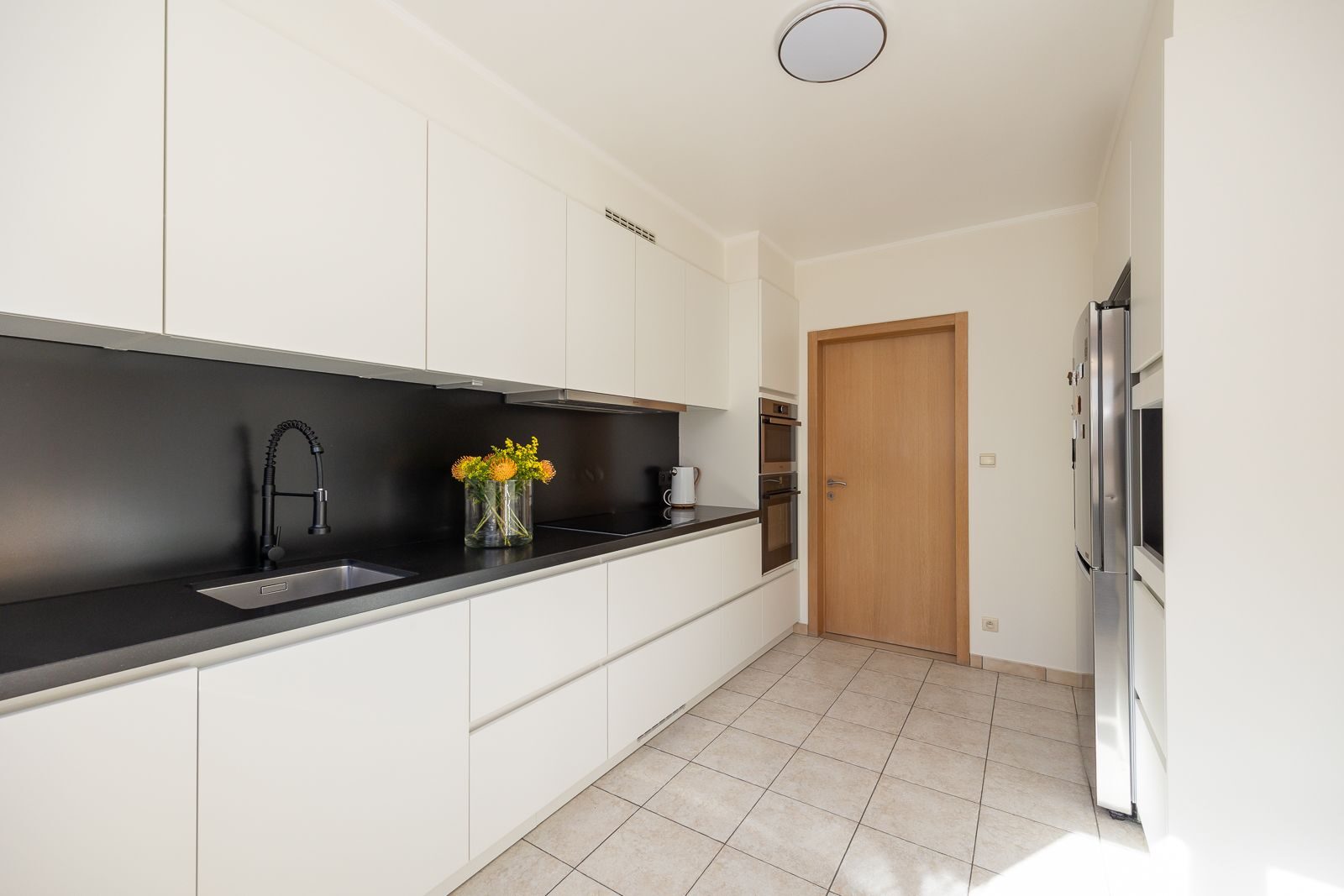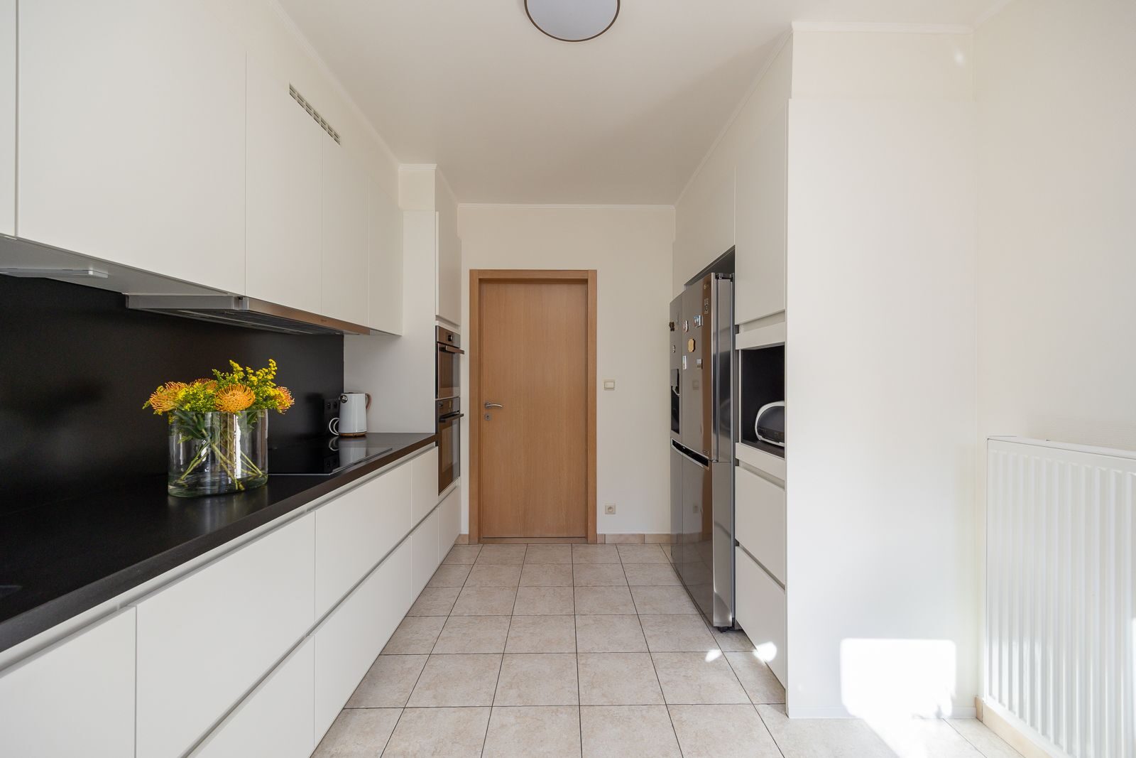 De kwalitatieve keuken werd volledig vernieuwd in 2023 en is uitgerust met een nieuwe inductiekookplaat, twee nieuwe ovens, een vaatwasser en voldoende opbergruimte. Aansluitend bevindt zich een praktische berging. Verder bereikt u de inpandige garage (27 m²) met aansluiting voor wasmachine en droogkast.