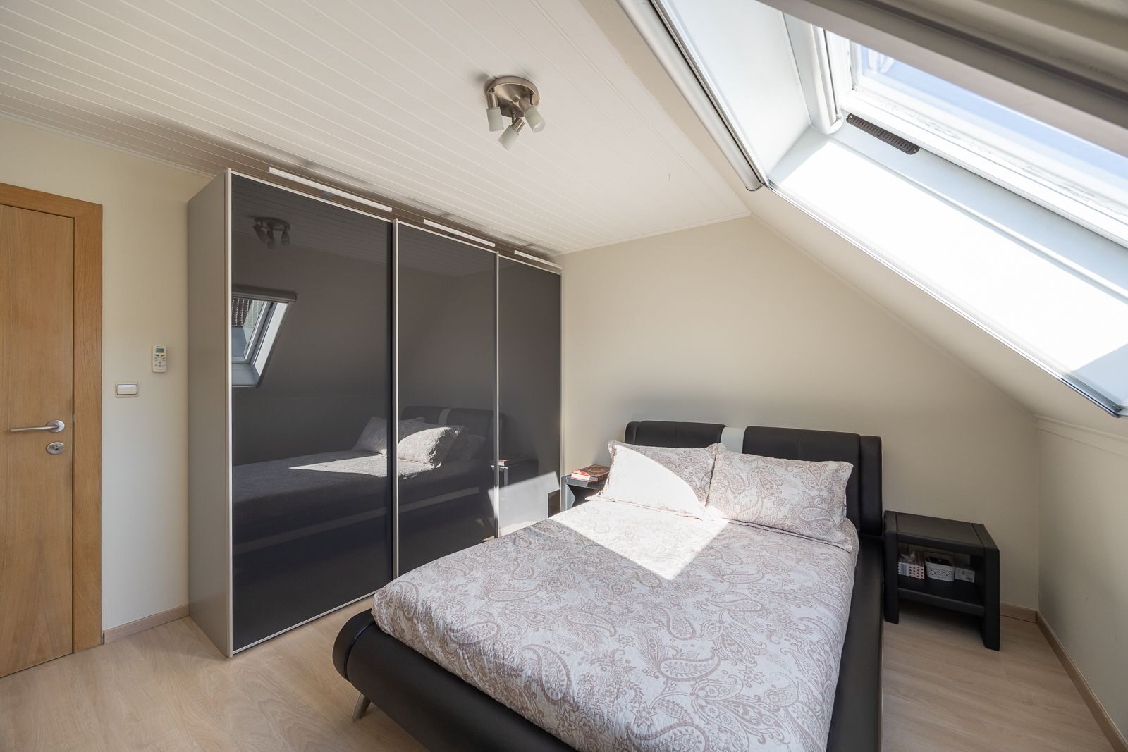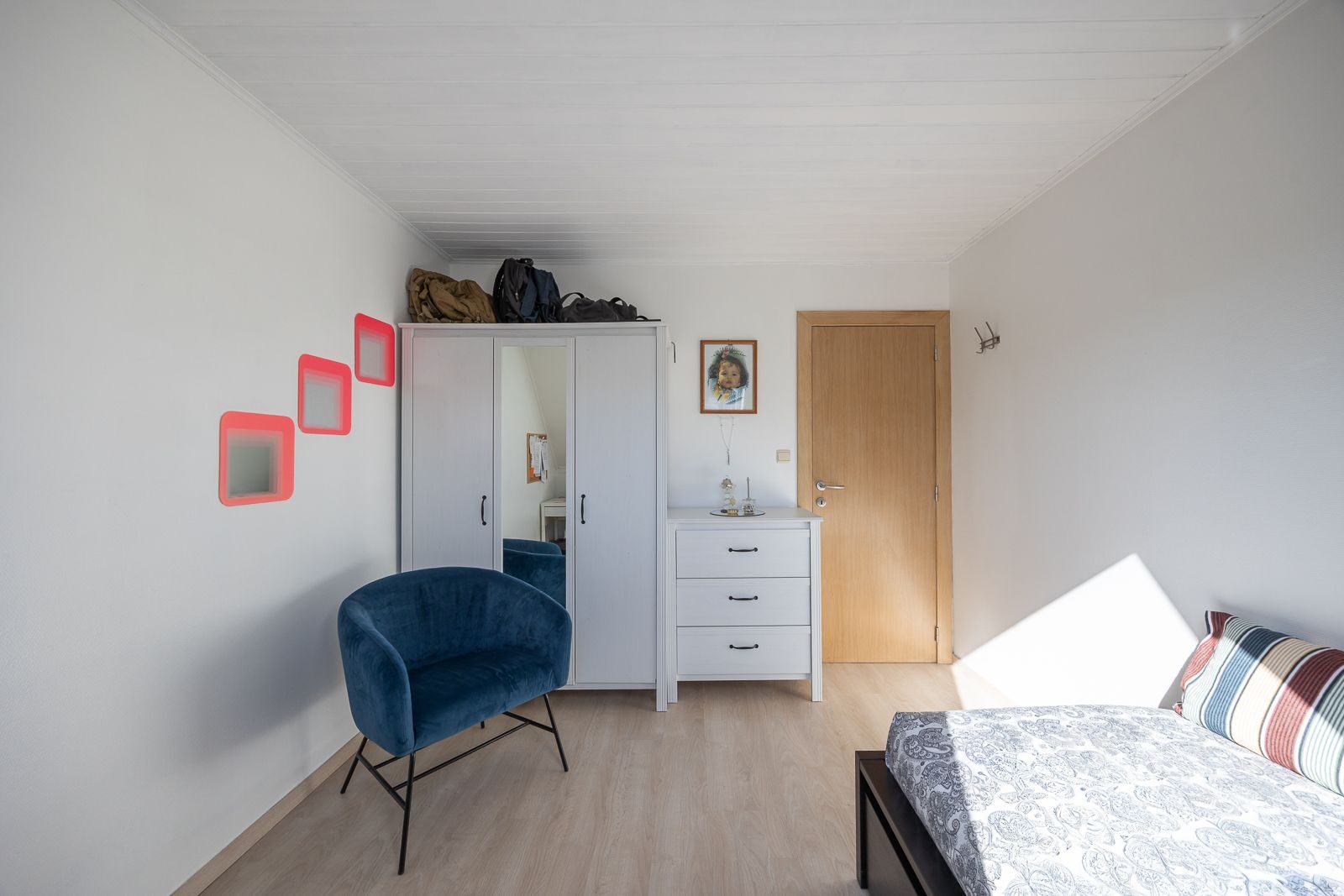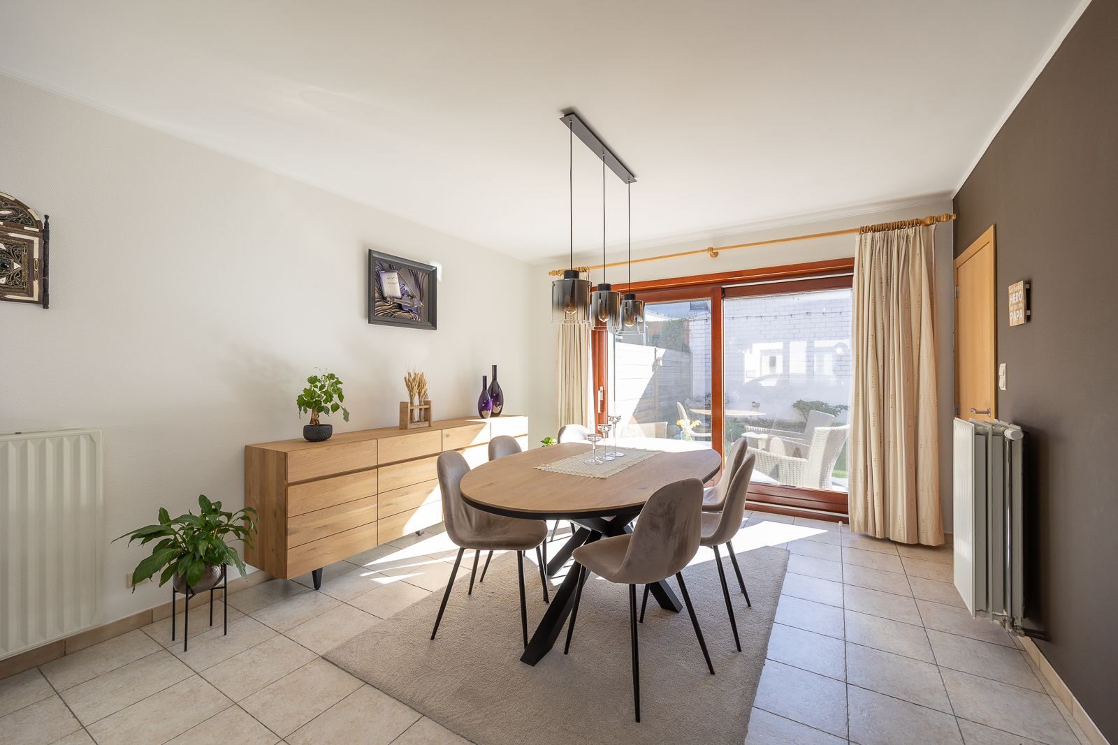 De inkomhal biedt toegang tot een lichtrijke en ruime leefruimte waar zit- en eetplaats naadloos in elkaar overlopen. Dankzij het grote schuifraam geniet u hier van veel natuurlijk licht en een mooi zicht op de tuin en het terras met zonnewering. De tuin geniet van veel privacy en is bovendien bereikbaar via de zij-ingang langs de oprit.